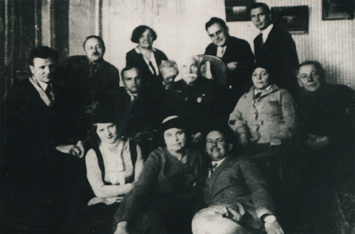 П. К. Саксаганський (в центрі) серед акторів Київського обласного драм. театру ім. П. К. Саксаганського. Зліва направо: І ряд – Кольцова, Адолинська, Натусь, ІІ ряд – Романов, Недоля, ІІІ ряд – Свердлов. Репродукція, 1940 р.