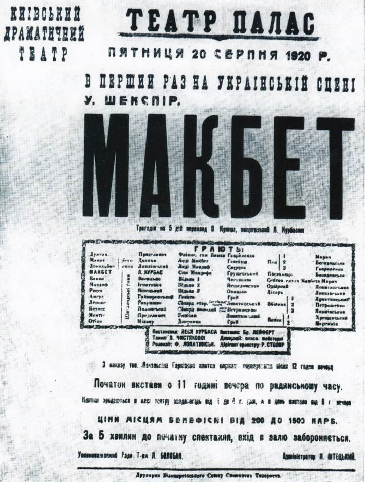 Чи був театр «бажаною дитиною» на білоцерківському мистецькому просторі? Безперечно. Ще наприкінці ХІХ ст. тут з успіхом гастролювала трупа Свєтлова і Милославського, а початок ХХ ст. ознаменований діяльністю Леся Курбаса. Саме в Білій Церкві відбулася визначна подія в житті не лише міста, а й усієї України – у липні 1920 року в театрі «Палас» було вперше українською мовою показано трагедію В. Шекспіра «Макбет», в якій головні ролі виконували Л. Курбас і Л. Гаккебуш.