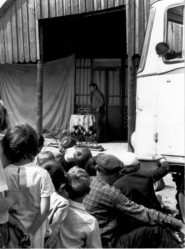 Вистава «Королева тюльпанів» на польовому стані. На сцені актор М. Кольцов. Справа – «гримерка» (автобус). Для дітей найкращі – «м’які» – місця.